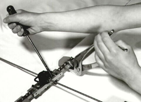 Brutal, aber einfach und preiswert: Beim HEGI-Baukasten wurde der Anstellwinkel der Rotorblätter einfach durch Verbiegen der Blattanschlüsse eingestellt. Das Bild stammt aus der Bauanleitung des Rotorkopfes mit den Schlaggelenken und dem Kunststoff-Kardangelenk an der Rotornabe. |